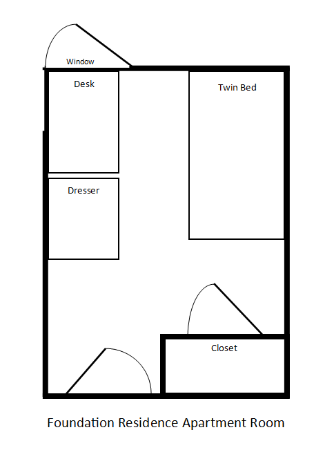 An average Foundation Residence Apartment houses four students. Each student gets their own bedroom which is furnished with a twin size bed frame and mattress, desk, three drawer dresser, and a built-in closet. A hook-up for high speed internet, and wireless internet, are provided in each room.