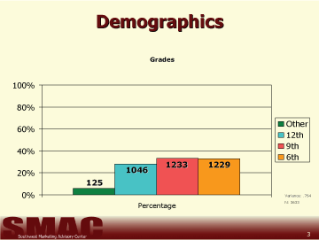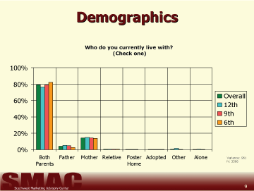 - A questionnaire was then developed by SMAC; it was tested, and refined until its format was determined to be valid for use with students in 6th, 9th, and 12th grades. The 54 school districts previously contacted by SMAC were invited to participate in this portion of the study by asking their students in these grades to complete the questionnaire. Questionnaires along with instructions for administers were sent to each school district volunteering to participate. Following students completion, the questionnaires were returned to SMAC for coding and analysis.