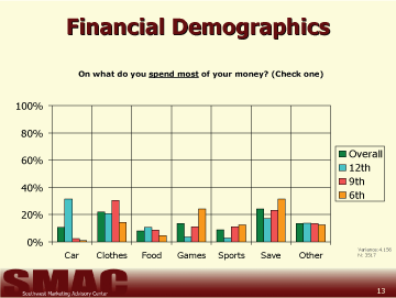 The most popular response for 12th graders was "Car", for 9th graders "Clothes", and 6th graders "I save it (don't spend it)" (Chart 10).