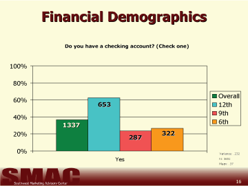 - 12th graders were most likely to have a checking account, however, the responses in this study indicated 6th graders were more likely to have a checking account than 9th graders