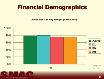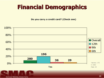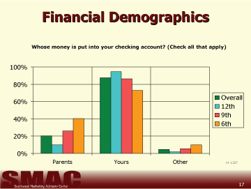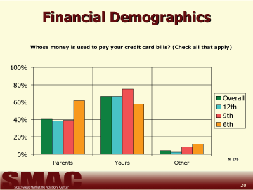 Those students in 6th grade seem to pay for about half of their credit card bills, 9th and 12th graders tend to pay for a majority of their credit card bills, but still receive help from their parents (Chart 17).