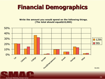 Approximately 30 percent of 9th and 12th graders' money would be spent on college, 20 percent would be spent on a car (Chart 18).