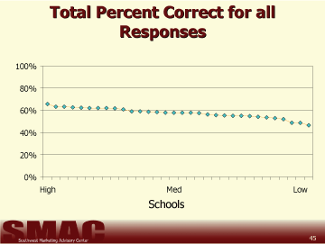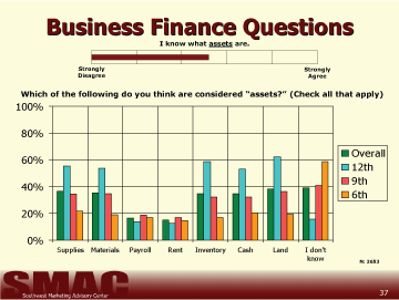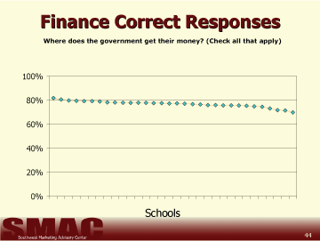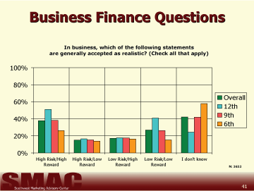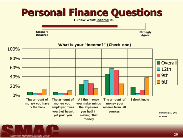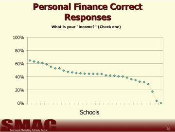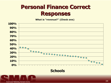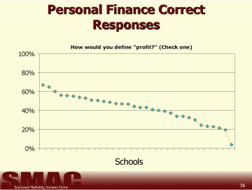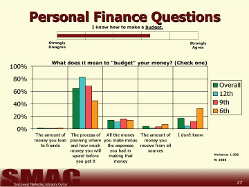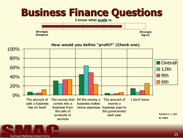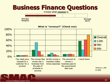 The questions used to determine student's understanding of business and personal finance were developed as a result of responses and discussions during preliminary focus groups held with each of the subject age groups in three districts. The questions students were asked to answer in this study are in no way intended to give a scientifically reliable gauge of the students' total knowledge regarding personal or business finance. Our goal was only to grasp a basic understanding of the capabilities amongst 6th, 9th, and 12th grade students and compare each of the 54 school districts invited to participate in the study. From these results, it is possible to determine the respondents' basic understanding of finance within these districts. It is not possible to determine the reasons for the variance in the scores from this study.