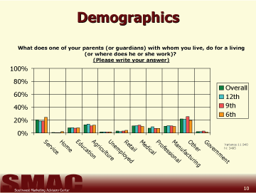 The responses to the open-ended questions were recorded by SMAC, then grouped into the following 11 categories and entered into SPSS: Service Industry, Home, Education, Agriculture, Unemployed, Retail, Medical, Professional, Manufacturing, Other, and Government.