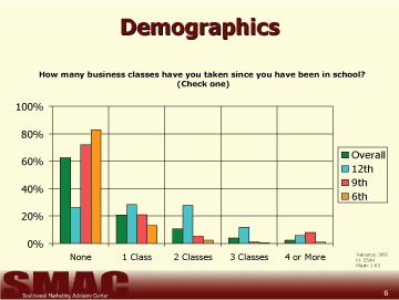 Over 80 percent of 6th graders have never taken a business class. Over 70 percent of 12th graders have taken at least one business class. Approximately 75 percent of 9th graders have never had a business class (Chart 6).