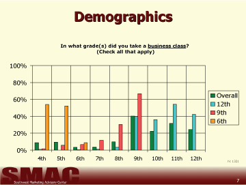 Looking at the data, a majority of 9th graders indicated they were currently in a business class. Most 12th graders had a business class in 11th grade and most 6th graders had a business class in the 4th grade (Chart 7). This seems to indicate that some effort is being made to infuse business curriculum into earlier grades than had previously been the case.