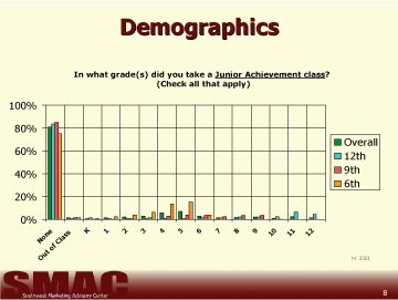 Over 80 percent of 12th graders indicated they have never taken a Junior Achievement class and over 75 percent of 6th graders have never taken a Junior Achievement class. Most 6th graders had a Junior Achievement class in 5th grade (Chart 8). It appears that Junior Achievement is beginning to have more of a presence in the activities of younger students than was previously the case.